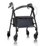 Il telaio in alluminio rende il deambulatore maneggevole e facile da spingere, anche per persone con forza ridotta nelle braccia. Il sistema di freno a pressione consente di bloccare il rollator semplicemente esercitando una lieve pressione verso il basso, senza l’utilizzo di leve manuali, risultando particolarmente intuitivo.