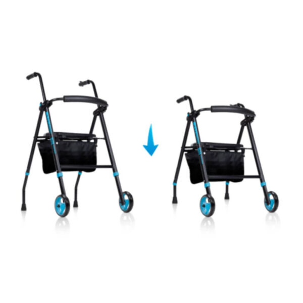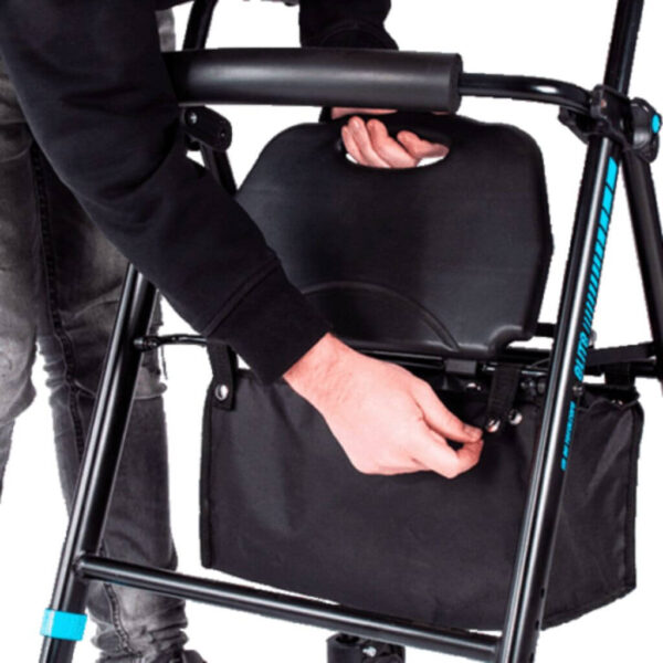 La seduta integrata, regolabile in altezza, offre un valido supporto durante le pause. Lo schienale imbottito contribuisce ad aumentare il comfort quando ci si siede, rendendo il deambulatore adatto anche a utilizzi prolungati all’esterno. Il tutto è completato da un cestino in tessuto rimovibile e lavabile, ideale per trasportare piccoli oggetti, borse o la spesa quotidiana.
