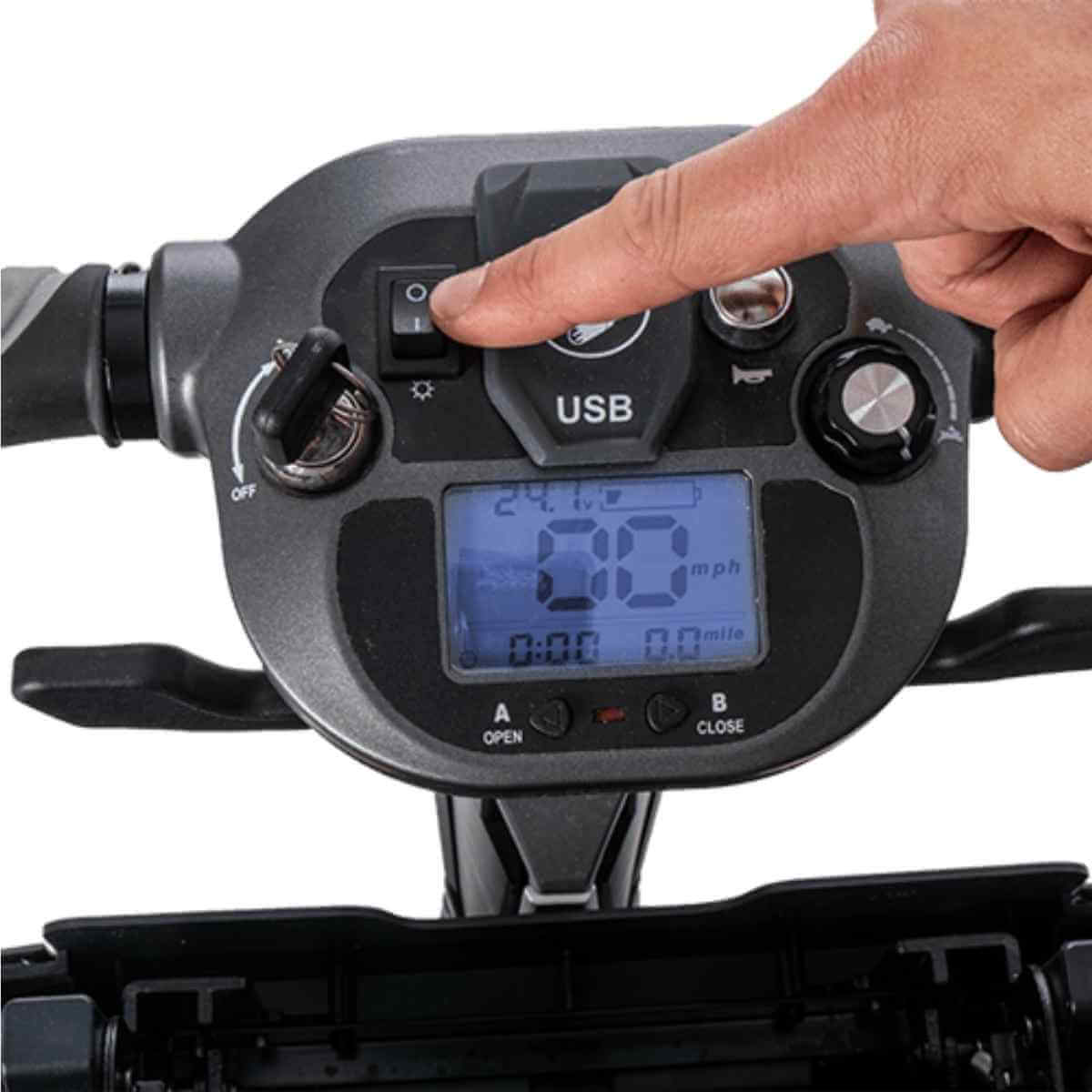 Dotato di luci a LED anteriori, garantisce ottima visibilità anche nelle ore serali. Le ruote antiribaltamento e il sistema di frenata elettromagnetica assicurano stabilità totale. Il cruscotto è dotato di un moderno display TFT che offre una chiara lettura della velocità, livello batteria e chilometri percorsi. Include inoltre una porta USB per ricaricare i tuoi dispositivi in movimento.